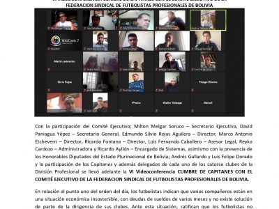 VI VIDEOCONFERENCIA CUMBRE DE CAPITANES CON EL COMITÉ EJECUTIVO DE LA FEDERACION SINDICAL DE FUTBOLISTAS PROFESIONALES DE BOLIVIA 10 Jul 2020Ricardo Ayllon 0