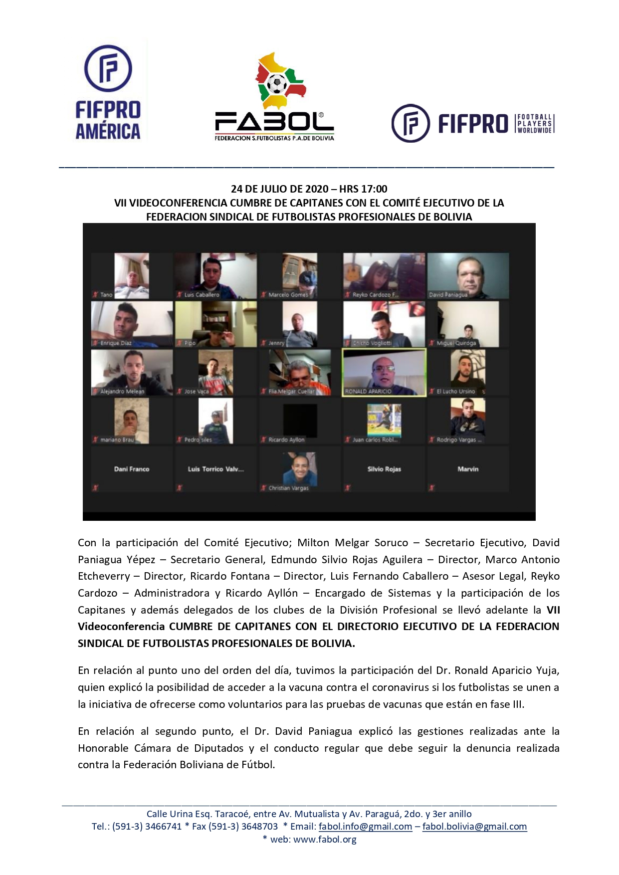 VII VIDEOCONFERENCIA CUMBRE DE CAPITANES CON EL COMITÉ EJECUTIVO DE LA FEDERACIÓN SINDICAL DE FUTBOLISTAS PROFESIONALES DE BOLIVIA